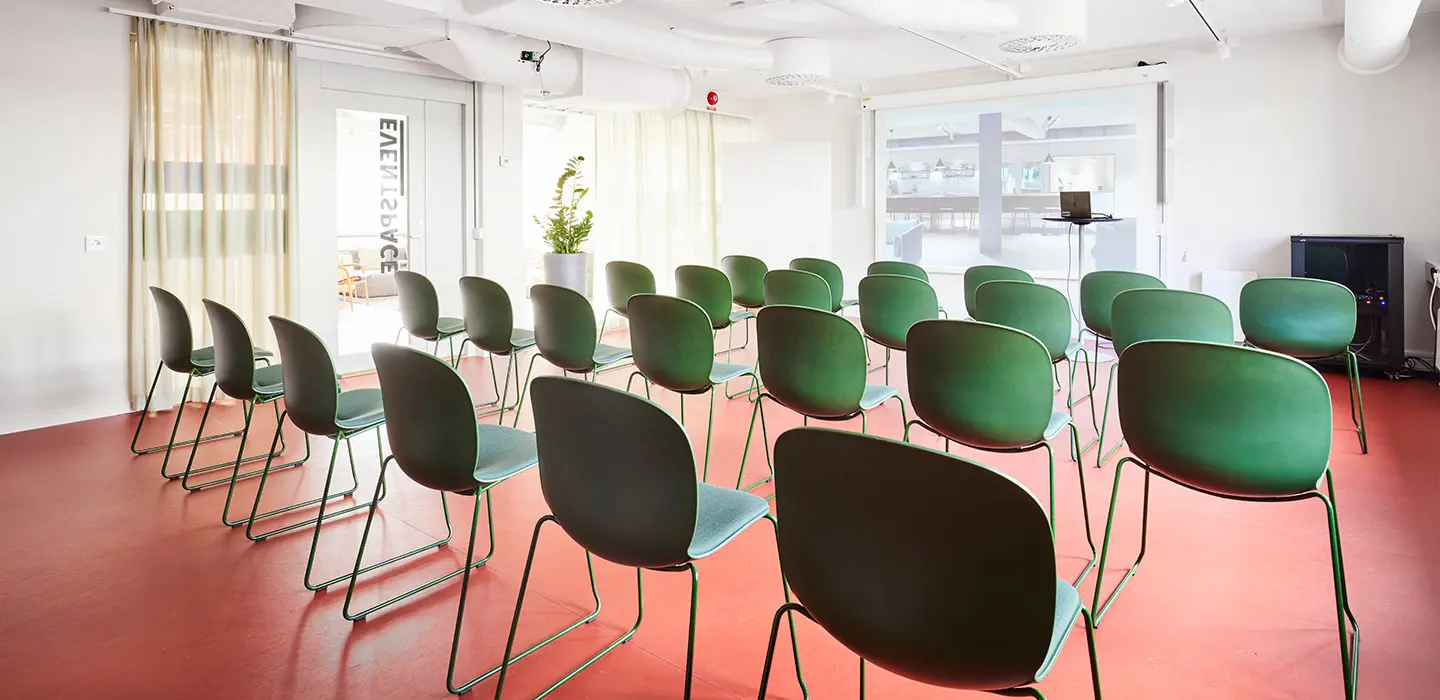 - Eventspace: 40 personer i biosittning | 25 i skolsittning | 16 st u-sittning | ca 28 - 30 st i öar